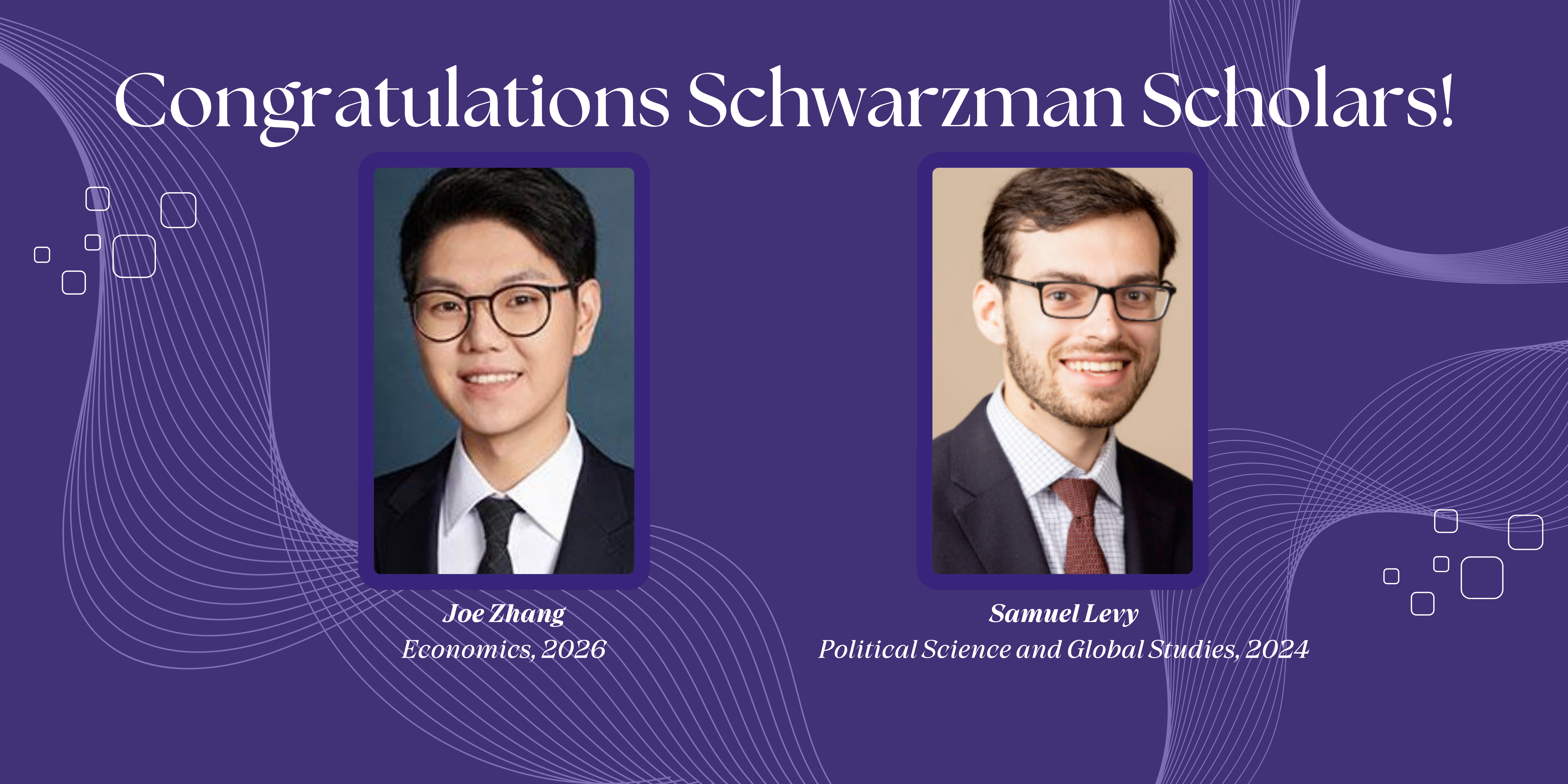 Congratulations to Sam Levy (Political Science & Global Studies, 2024) and Joe Zhang (Economics, 2026) who will be joining the 11th Cohort of Schwarzman Scholars!