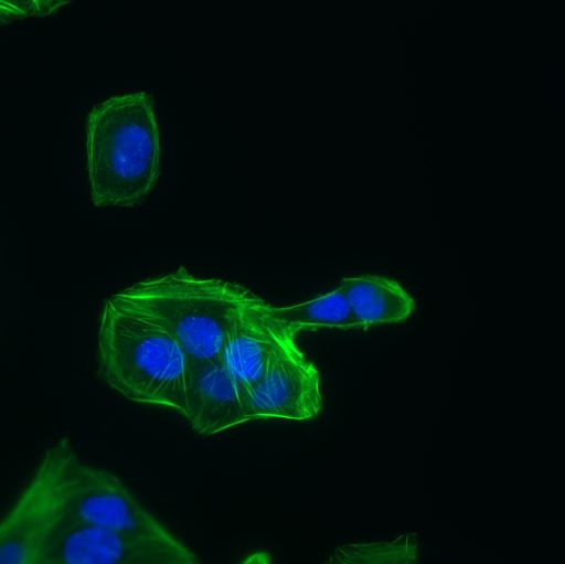 Pictured: Bernadette Miao, 2020-2021 College Summer Research Scholars awardee, who took this photo of U2OS cells under fluorescence imaging on the 60x objective of the Tian Lab’s Nikon Ti2-E. (8/3/21).